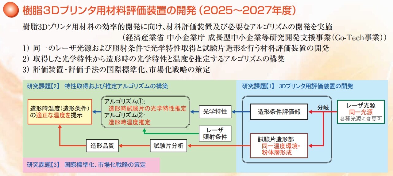 | 樹脂3Dプリンタ用材料評価装置の開発 | 樹脂3Dプリンタ用材料の効率的開発に向け、材料評価装置及び必要なアルゴリズムを開発します。また、技術・産業動向および国際標準化動向の調査を行います。 | 2025~2027年度 |
